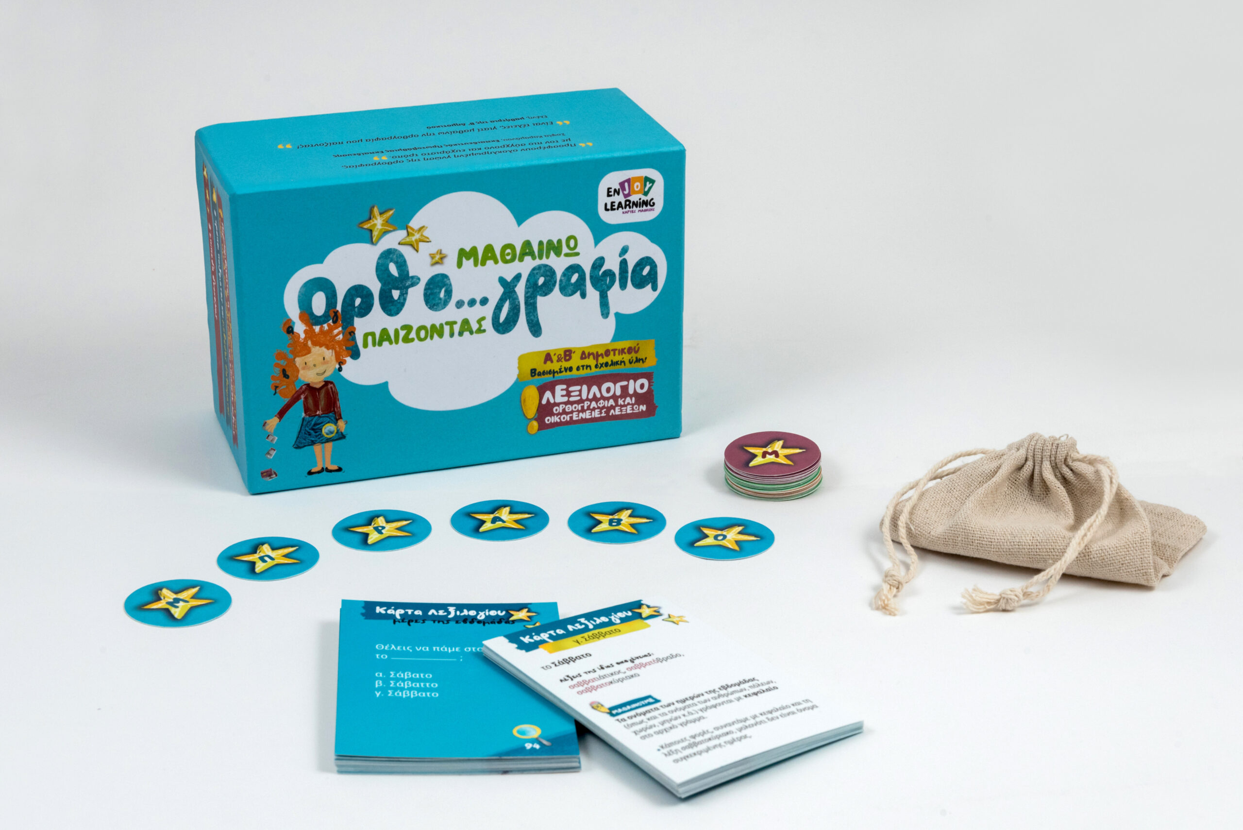 Παιχνίδι 285 καρτών. Περιλαμβάνει την ορθογραφία και τις οικογένειες όλων των λέξεων της ύλης της Α’ Β’ Δημοτικού και επιπλέον λέξεων. . Έχει 2 επίπεδα δυσκολίας και παίζεται με 3 διαφορετικούς τρόπους. Επίσης, η δομή των καρτών είναι τέτοια, ώστε το παιδί μπορεί να διαβάσει μόνο του, με τη μέθοδο των flashcards.