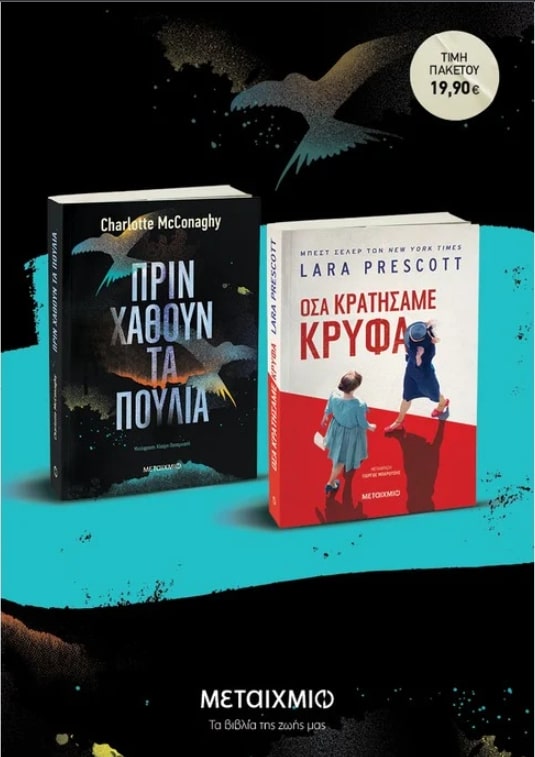 Πριν χαθούν τα πουλιά: Μια ωδή στους άγριους τόπους και τα πλάσματα που τώρα απειλούνται, και μια επική ιστορία για τη δυνατότητα της ελπίδας πέρα από κάθε πρόβλεψη. Ένα άγριο, καθηλωτικό και βαθιά συγκινητικό μυθιστόρημα. // Όσα κρατήσαμε κρυφά: Βρισκόµαστε στην αυγή του Ψυχρού Πολέµου, κι οι λέξεις έχουν γίνει όπλα. Στη Μόσχα, η Όλγα Ιβίνσκαγια συλλαµβάνεται. Είναι η ερωµένη και µούσα του Μπορίς Παστερνάκ – του πιο διάσηµου εν ζωή συγγραφέα στη Σοβιετική Ένωση. Το καθεστώς γνωρίζει ότι ο Παστερνάκ γράφει ένα µυθιστόρηµα µε τίτλο Δόκτωρ Ζιβάγκο που ασκεί δριµεία κριτική στην Οκτωβριανή Επανάσταση. H CIA οργανώνει µια αποστολή για να αποκτήσει το χειρόγραφο, να το τυπώσει κρυφά, και να το περάσει λαθραία στην ΕΣΣΔ. Οι πράκτορες που θα αναλάβουν να τη φέρουν σε πέρας δεν είναι παρά δυο δακτυλογράφοι –η γοητευτική Σάλι που διαθέτει σχετική εµπειρία και η ταλαντούχα αλλά πρωτάρα Ιρίνα– των οποίων η ζωή θα αλλάξει για πάντα.