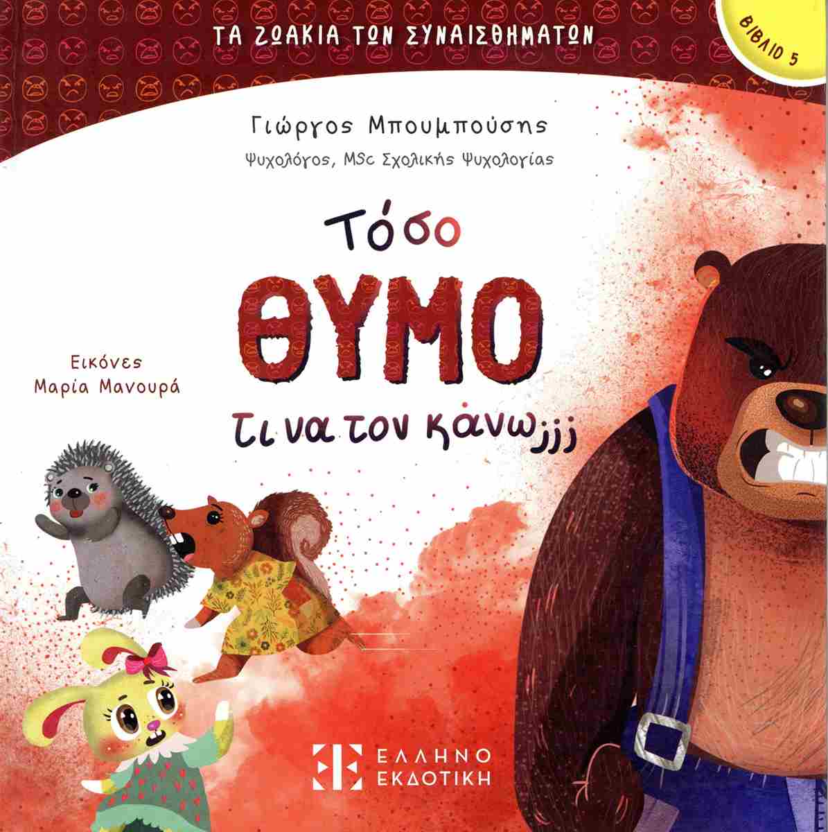 Η σειρά ΤΑ ΖΩΑΚΙΑ ΤΩΝ ΣΥΝΑΙΣΘΗΜΑΤΩΝ, του ψυχολόγου MSc σχολικής ψυχολογίας Γιώργου Μπουμπούση, «συστήνει» στα παιδιά ηλικίας 4-7 ετών τα διαφορετικά συναισθήματα δείχνοντάς τους πώς επηρεάζουν τις σκέψεις και τις συμπεριφορές μας αλλά και πόσο σημαντικά είναι στη ζωή μας.Τα αξιαγάπητα ζωάκια-συναισθήματα που πρωταγωνιστούν στις ιστορίες μαθαίνουν στα παιδιά ότι κανένα συναίσθημα δεν αποτελεί πρόβλημα· γίνεται πρόβλημα μόνο, όταν δεν εκφράζεται με τρόπο που συμβάλλει στην ψυχική ισορροπία μας και στην αρμονική συνύπαρξή μας με τους άλλους.Μέσα από τις ιστορίες της σειράς καλλιεργείται η συναισθηματική νοημοσύνη των παιδιών, ώστε να εκφράζουν και να διαχειρίζονται λειτουργικά όλα τα συναισθήματά τους, δεξιότητα αναγκαία για την ομαλή κοινωνικοποίησή τους.Ο αρκούδος Θυμός, όταν νευριάζει, βγάζει καπνούς από τ’ αυτιά.Το 5o βιβλίο της σειράς πραγματεύεται το συναίσθημα του θυμού δίνοντας έμφαση στους τρόπους διαχείρισής του.